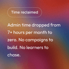 Admin time dropped from 7+ hours per month to zero. No campaigns to build. No learners to chase.